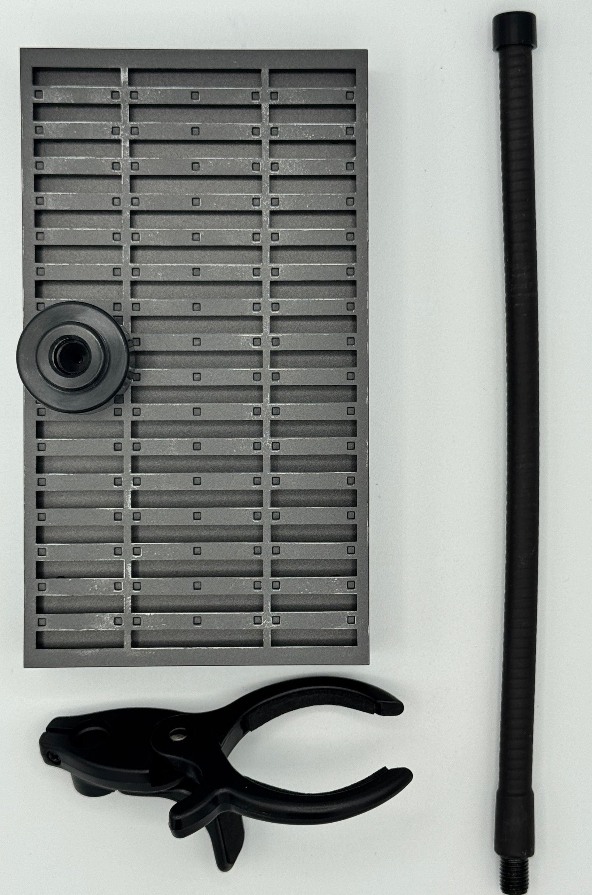 Grate themed base. The dynamic pole adapter is permanently fixed. Includes a dynamic pole and a clip.