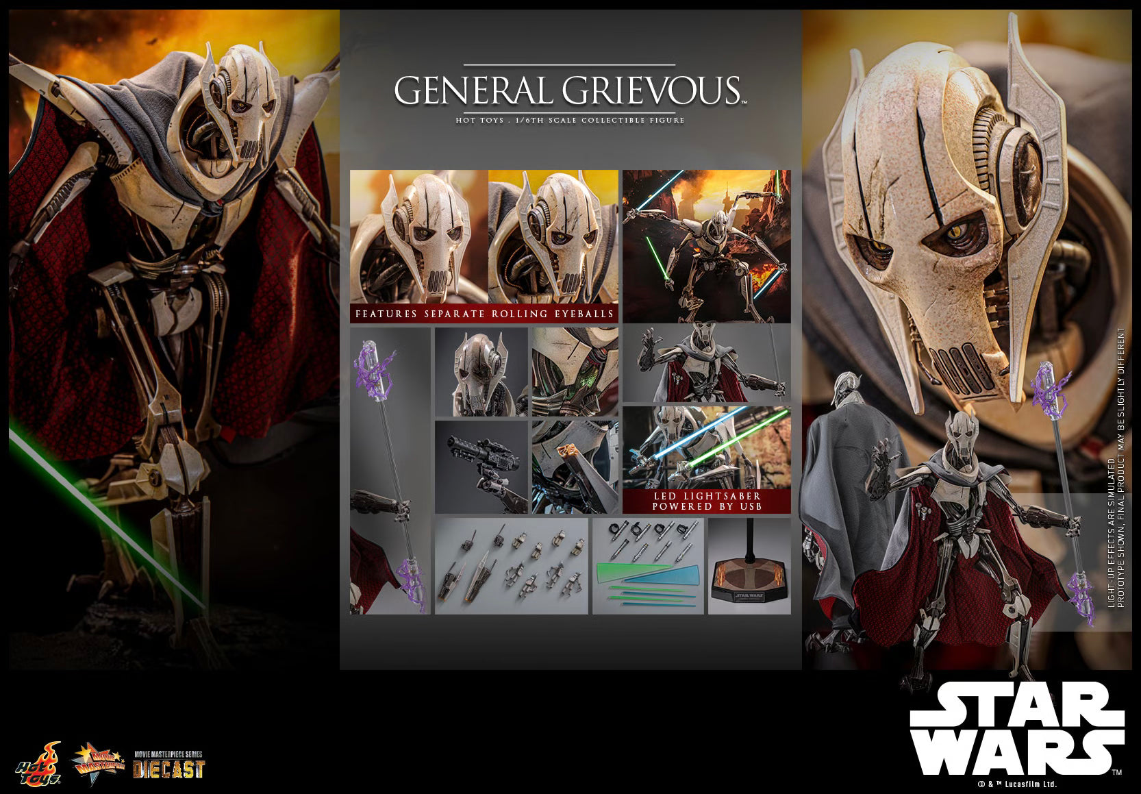 The highly detailed Star Wars collectible figure is masterfully created featuring a newly developed head with separate rolling eyeballs system allowing positionable eye line, diecast metal body structure allowing astonishing articulations, the general’s iconic four arms, LED light-up lightsabers powered by USB, a finely tailored wired cape, interchangeable battle damaged parts, an electrostaff, a blaster, and a display base!